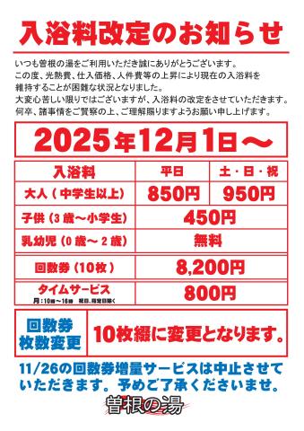 いつも曽根の湯をご利用いただき誠にありがとうございます。